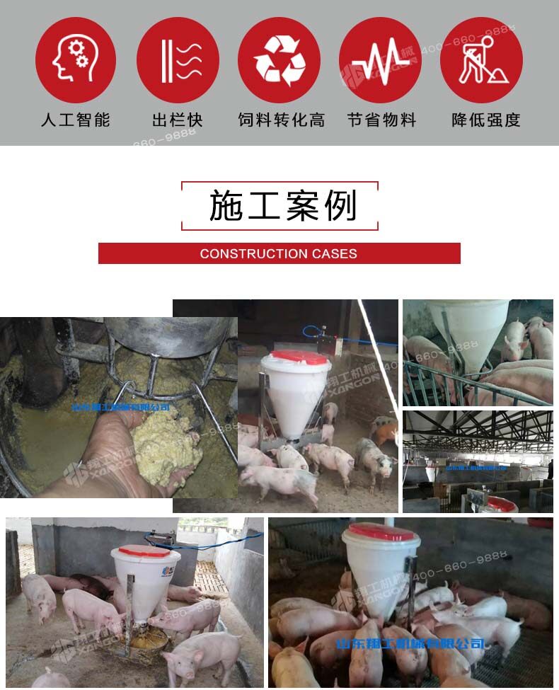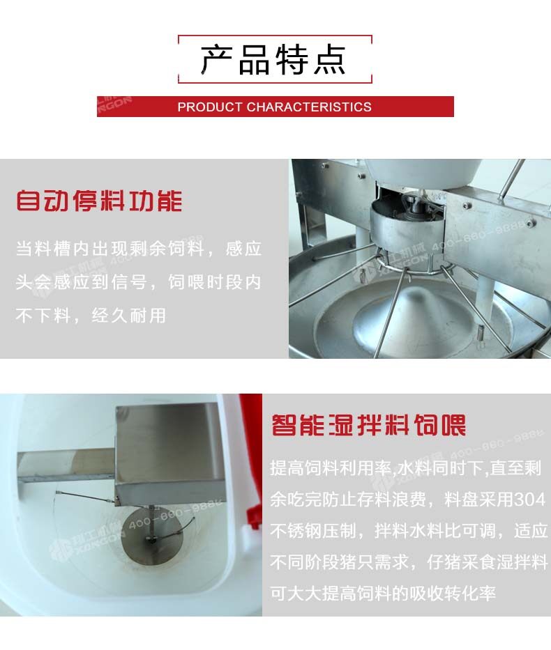 5.智能濕拌料飼喂,提高飼料利用效率。水和料同時(shí)下,在料盤(pán)內混合成適口性 較好的濕直到剩余飼料被小豬吃完,防止料槽內存料過(guò)多造成浪費。料盤(pán)采用304不銹鋼整體壓制,拌料,水料比可調節,以適應不同階段的豬只需求。仔豬采食濕拌料可以大大提高飼料的吸收轉化效率。