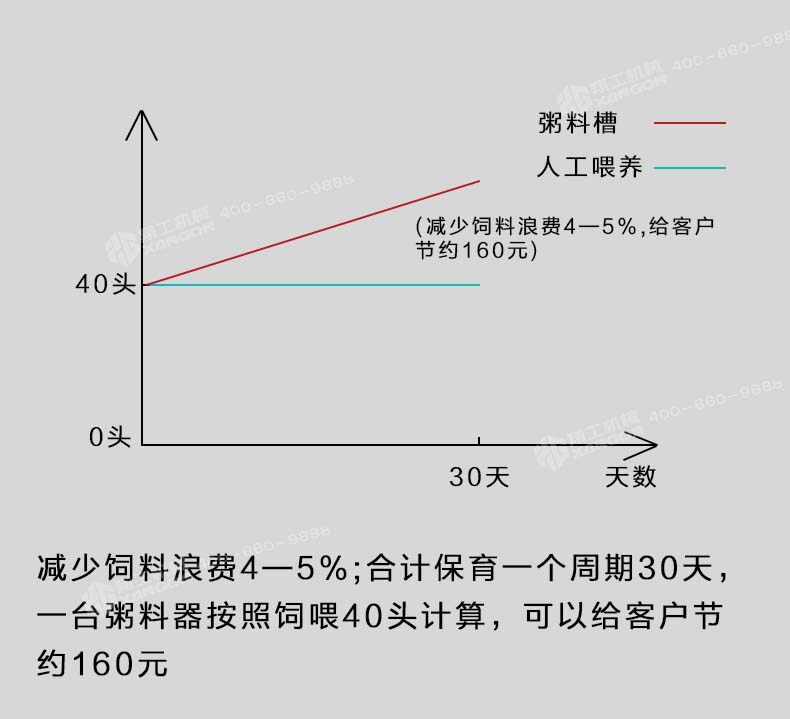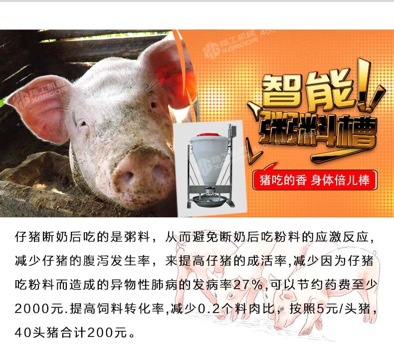 即便按照三個(gè)好處累加保育一次可以節約560元,一年按照使用粥料器保育6—8窩仔豬,累加一臺粥料器智能豬料槽通過(guò)在豬場(chǎng)的試驗得出驗證,解決了飼料轉化率,豬通過(guò)食料相比之前的飼喂每天多增重0.4斤,減少和杜絕了胃腸道病的發(fā)生幾率。合理采食的同時(shí)減少了飼料的浪費,省料即是省錢(qián),普通的飼喂飼料浪費率在5%-10%,豬場(chǎng)中使用了粥料器后飼料浪費率控制在2%左右。減少人員的勞動(dòng)強度,夜晚無(wú)法定量投喂的問(wèn)題。