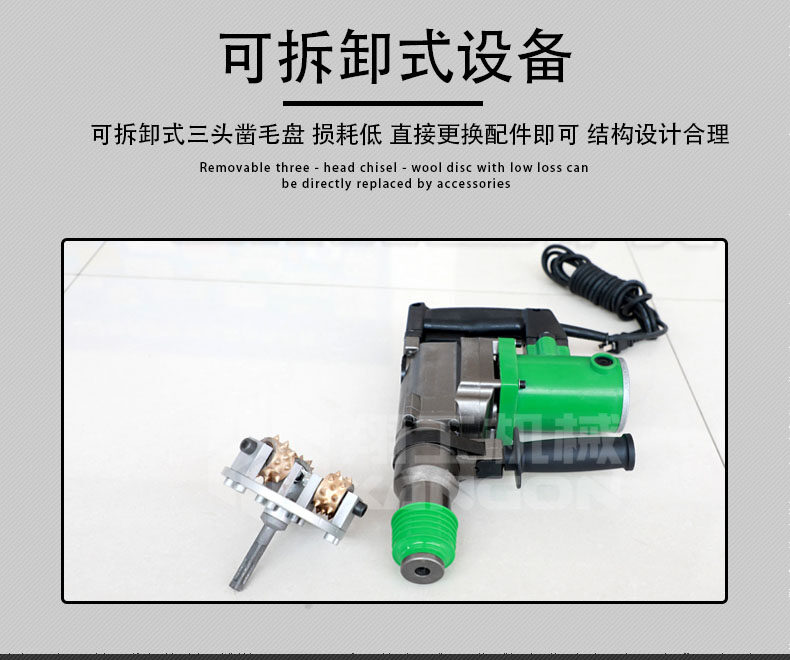 電動(dòng)手持式鑿毛機 金剛石三頭鑿毛設備 小型水泥路面拉毛機。該鑿毛機型主要應用于高鐵、高速公路橋面、隧道、水利水電、核電、市政道橋、大型集裝箱場(chǎng)地、停車(chē)場(chǎng)、室內外混凝土地面翻新除險加固等混凝土面層鑿毛工程