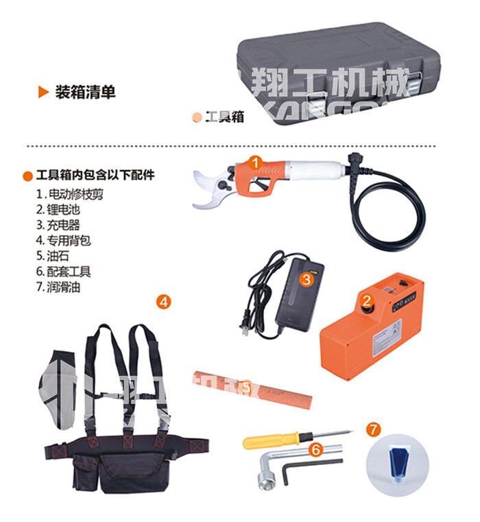 本產(chǎn)品為電池驅動(dòng)電動(dòng)修枝剪,由固定刀片、移動(dòng)刀片、鋰電池、充電器、連接線(xiàn)、工作包、工具箱等部分組成,充電電壓為AC 110V~240V,主要應用于30mm以下果枝嫁接的剪切和修剪及大批果園修剪、收摘等。使用時(shí)簡(jiǎn)捷方便,是傳統手工剪枝效率的8-10倍,修枝質(zhì)量明顯高于傳統手工剪刀。
