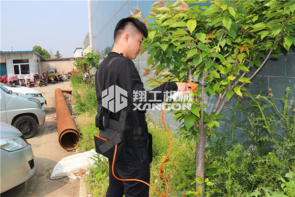 2.將電動(dòng)修枝剪固定連接電源穿過(guò)背包并連接到電池,穿戴好背包(把剪刀電源線(xiàn)穿入背帶的指定固定扣,防止使用時(shí)剪到電線(xiàn))