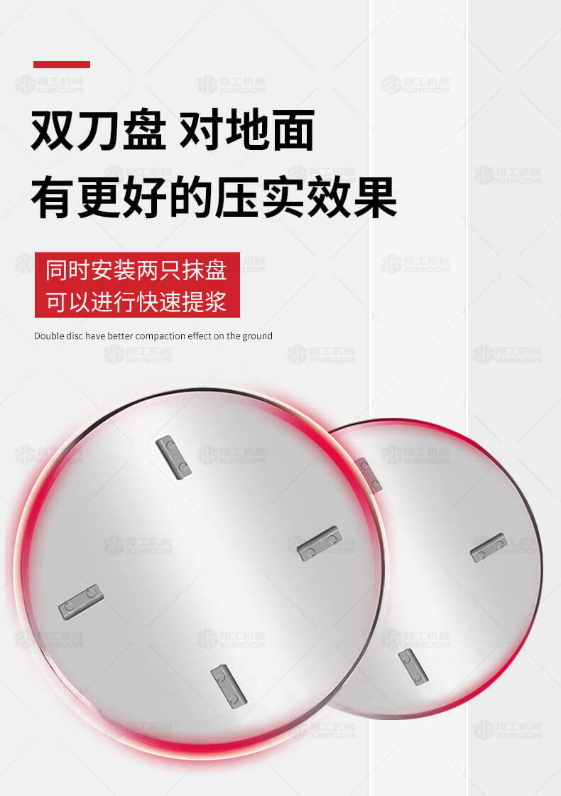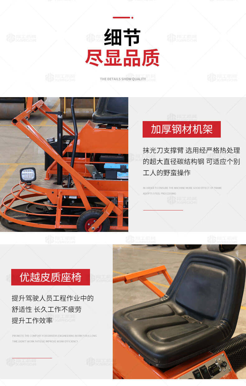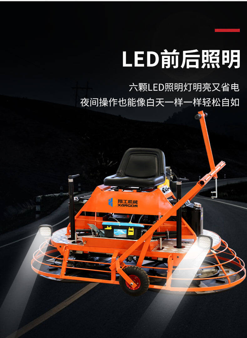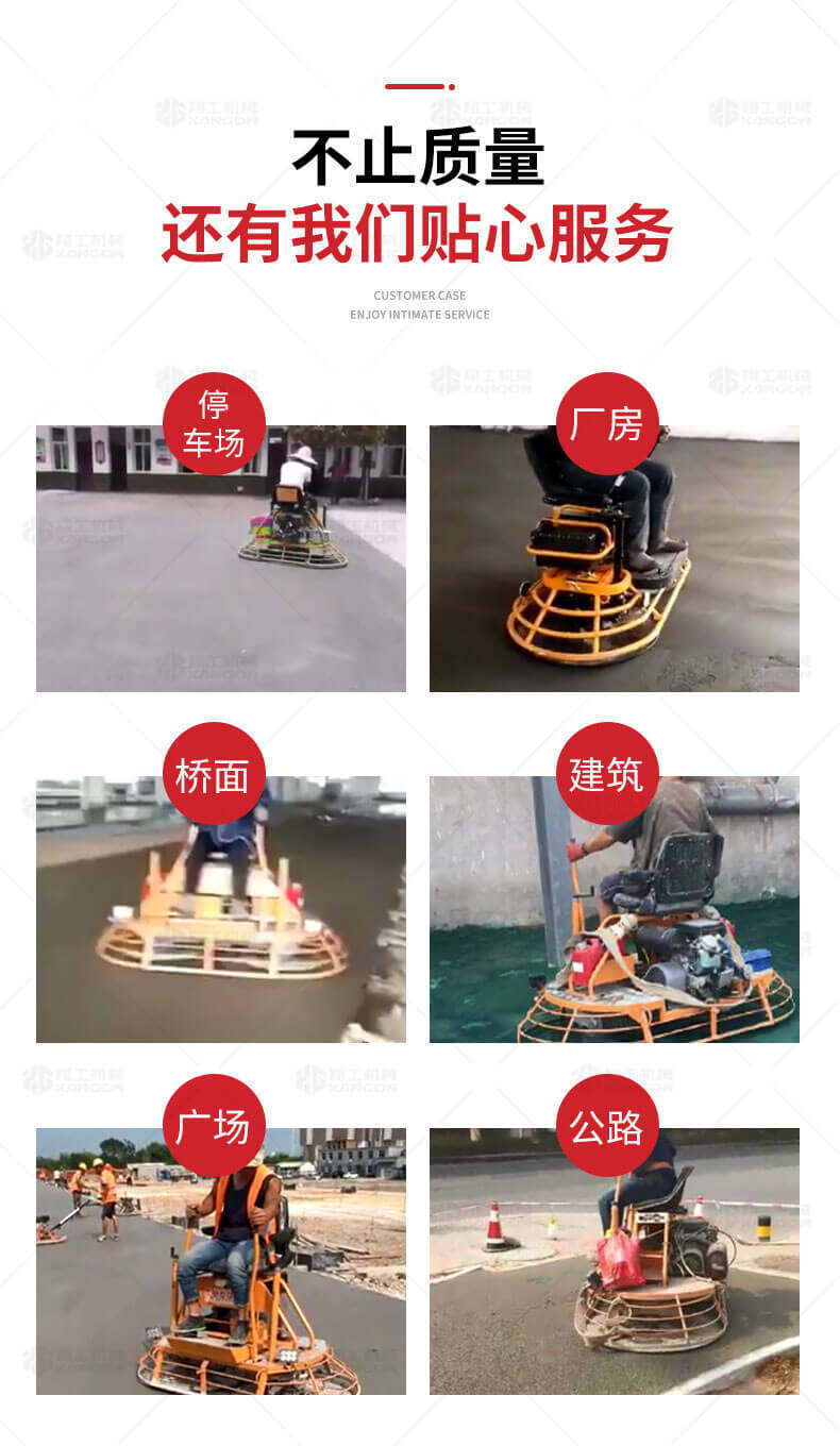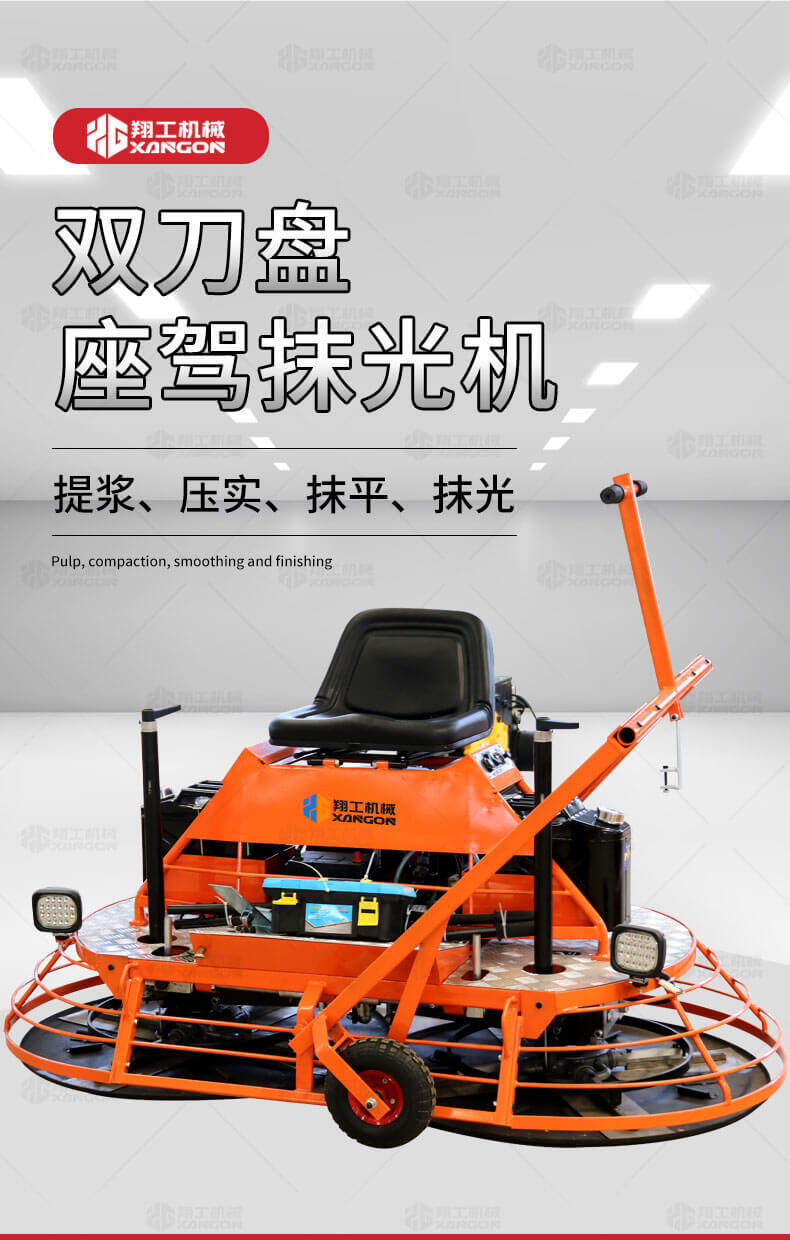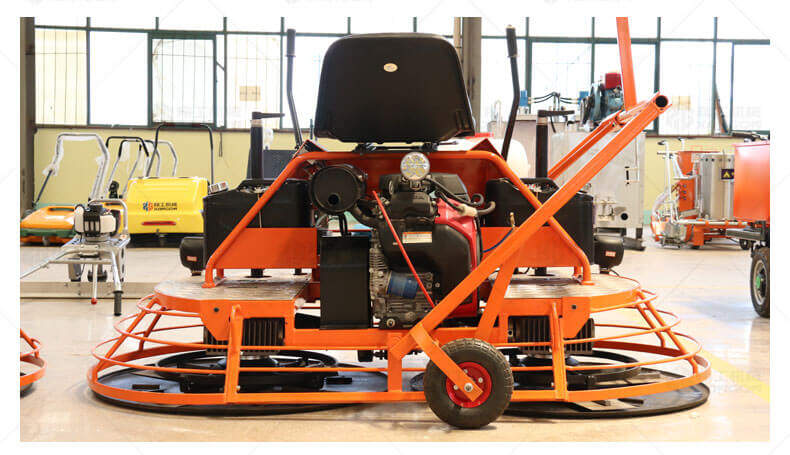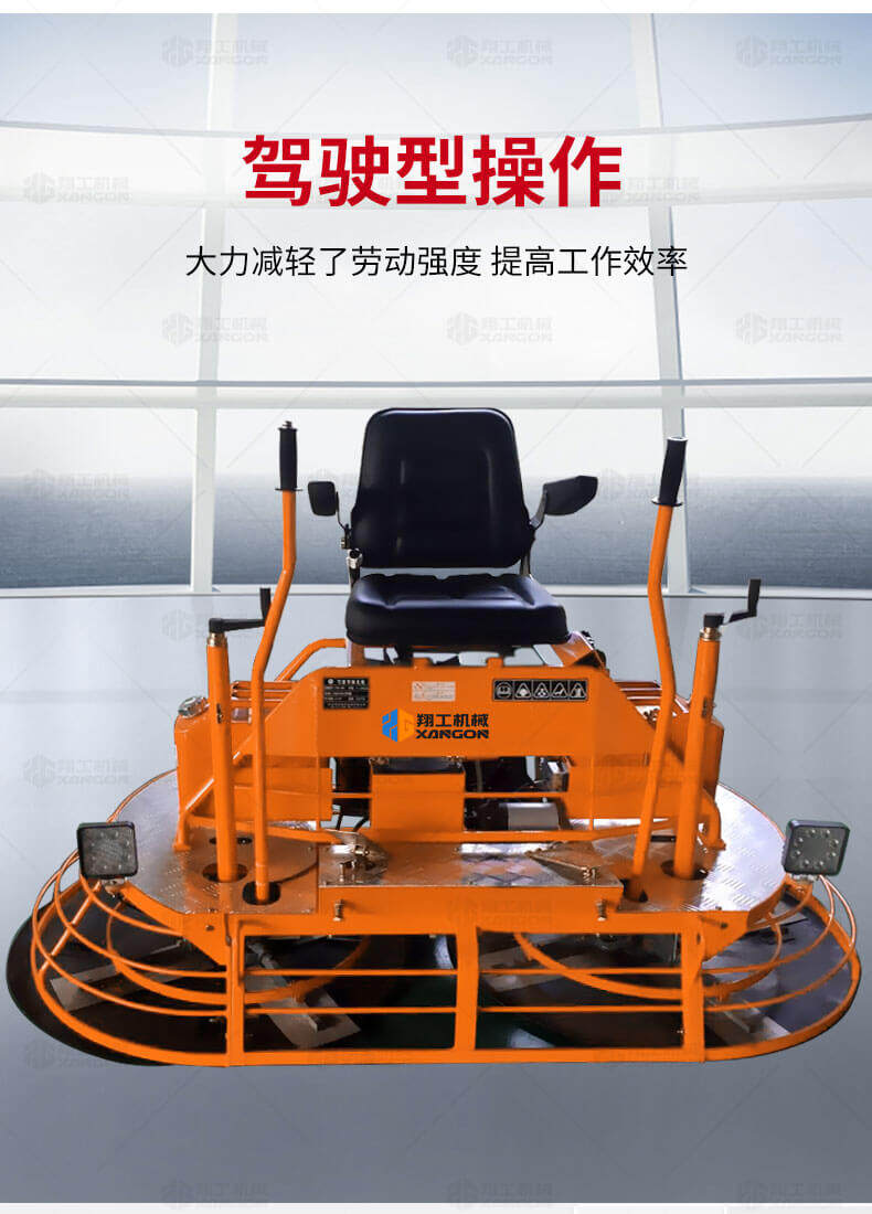 座駕式混凝土抹光機用于混凝土地面的提漿、壓實(shí)、抹平、抹光,相對于手扶式抹光機,效率高。