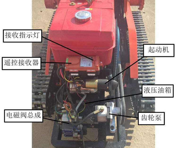 本機液壓系統由齒輪泵、電磁換向閥、油缸、油箱、油管、濾清器等元件組成,通過(guò)液壓系統的工作,可實(shí)現機器的轉向、臨時(shí)停車(chē),以及機具的升降。