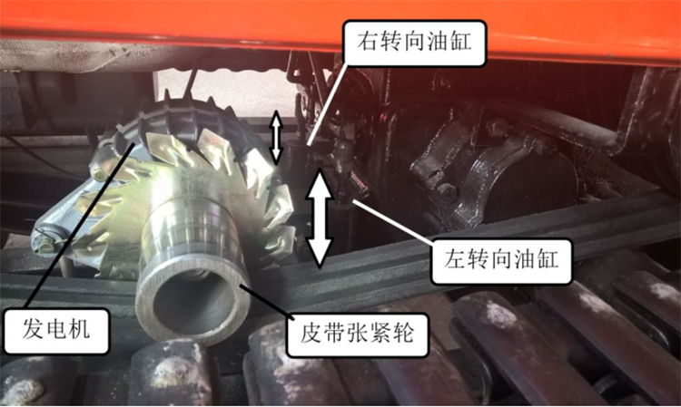 注意:左、右轉向油缸頂桿單獨推出,控制左、右轉向;同時(shí)推出為臨時(shí)停車(chē);直線(xiàn)行走時(shí)油缸收回;調整發(fā)電機拉桿漲緊皮帶。