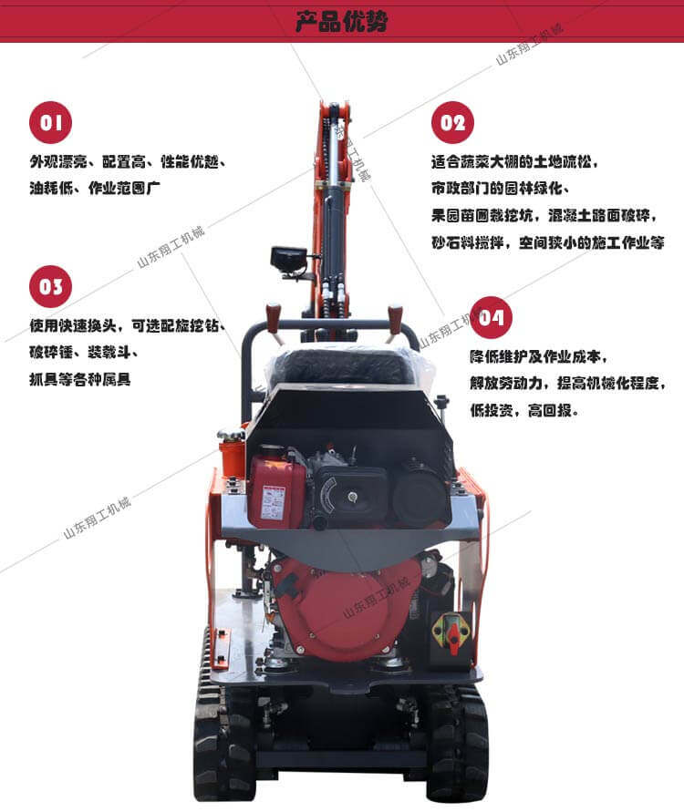 該產(chǎn)品外觀(guān)漂亮、配置高、性能優(yōu)越、油耗低、作業(yè)范圍廣,適合蔬菜大棚的土地疏松,市政部門(mén)的園林綠化、果園苗圃栽挖坑,混凝土路面破碎,砂石料攪拌,空間狹小的施工作業(yè)等,使用快速換頭,可選配旋挖鉆、破碎錘、裝載斗、抓具等各種屬具,降低維護及作業(yè)成本,解放勞動(dòng)力,提高機械化程度,低投資,高回報。