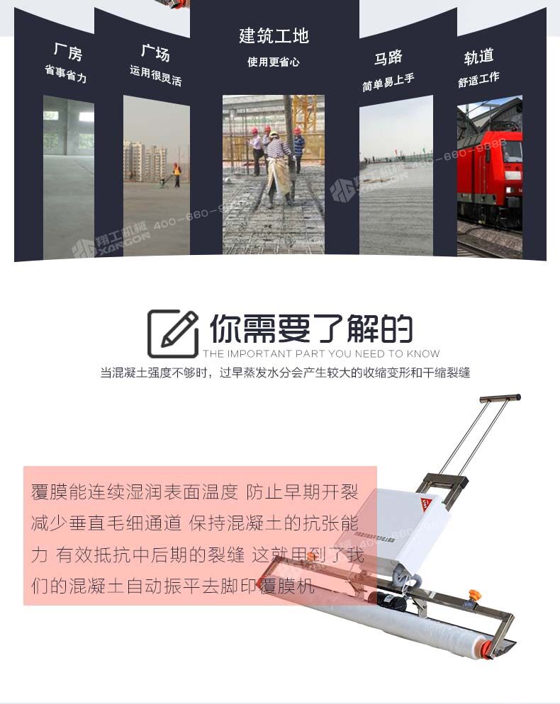 混凝土自動(dòng)振平去腳印覆膜機主要是用于混凝土澆筑的工作中,此款設備澆筑后會(huì )進(jìn)行覆膜養護,防止水分蒸發(fā)過(guò)快造成的脫水,混凝土自動(dòng)振平去腳印覆膜機助力推動(dòng)覆蓋薄膜養護普及進(jìn)程,保證混凝土施工效果。