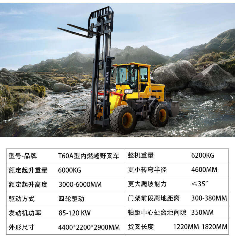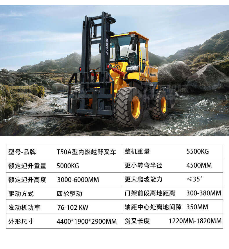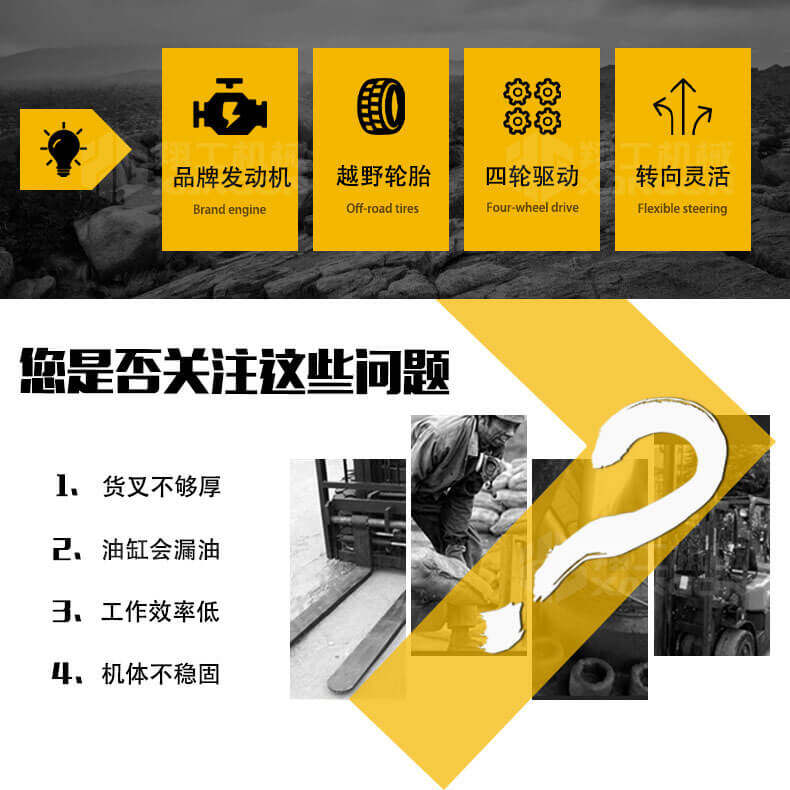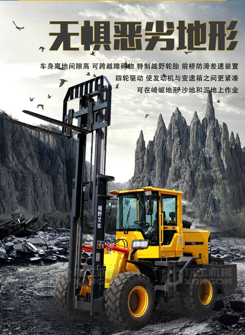 5.越野叉車(chē)發(fā)動(dòng)機功率大,采用全輪驅動(dòng)和越野輪胎。
