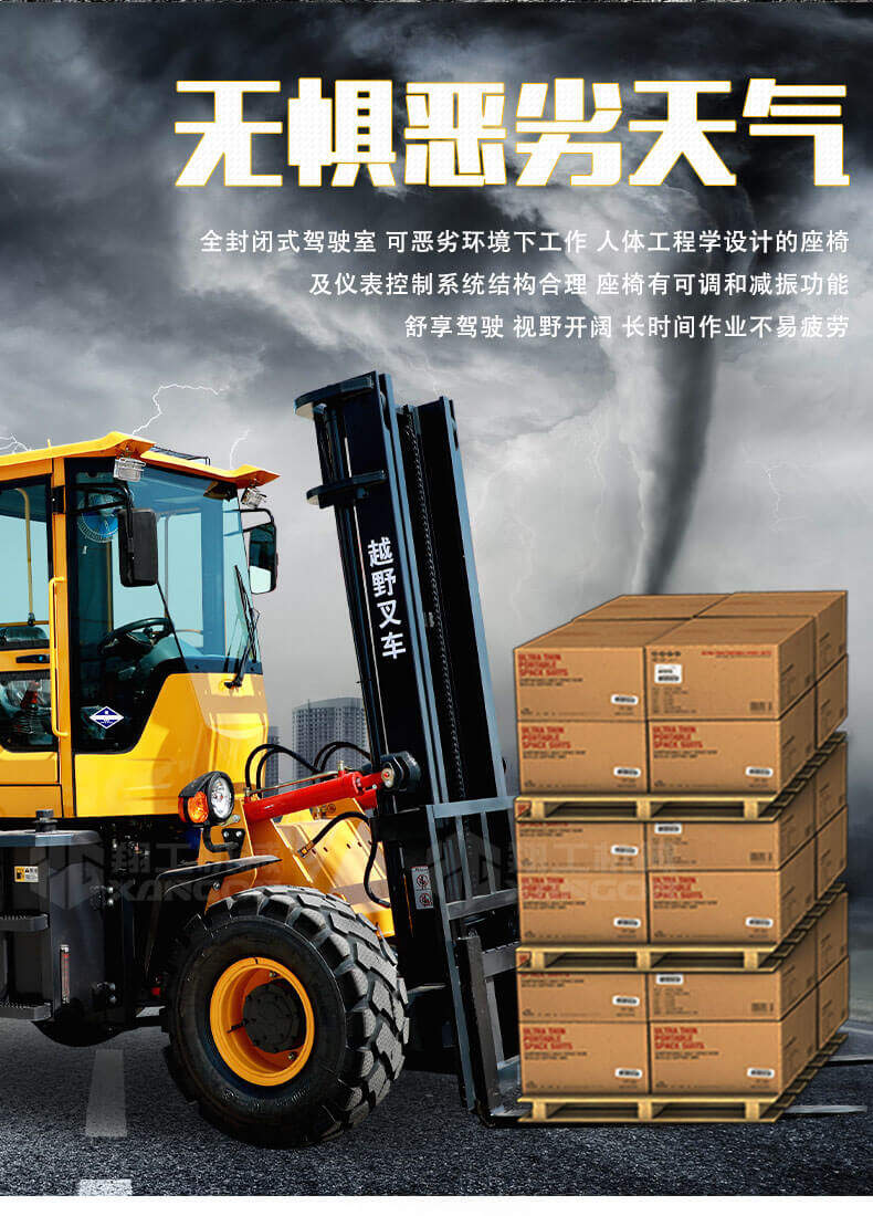 3.普通叉車(chē)只能在平整的路面上作業(yè),而越野叉車(chē)既可以在普通路面上作業(yè),還可以在山路泥路崎嶇道路作業(yè),輪胎抓地力強,不打滑。