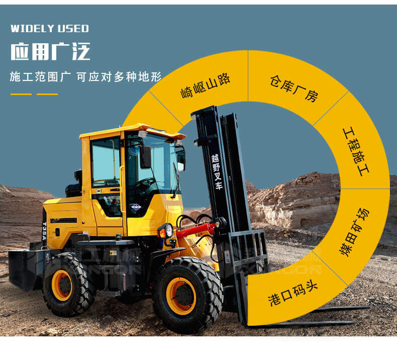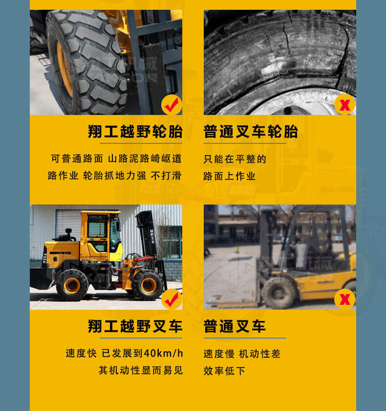 5.越野叉車(chē)發(fā)動(dòng)機功率大,采用全輪驅動(dòng)和越野輪胎。