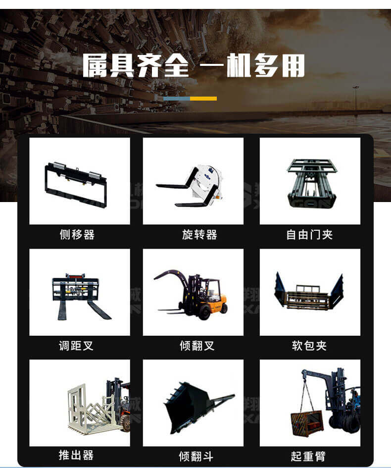 多功能越野叉車(chē)可以在坡地和不平地面上進(jìn)行貨物裝、卸、堆垛及搬運作業(yè),具有良好的機動(dòng)性、越野性可靠性。其功能多樣,可搭配側移器、調距叉、旋轉器、軟包夾、推出器、側翻叉、側翻斗、起重臂等工具完成不同的工作。