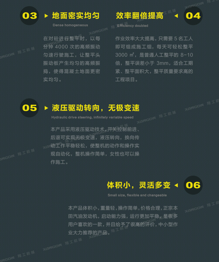 3,本產(chǎn)品能一次性鋪設混凝土基層,將其抹平將其震蕩光滑,您的工作速度將大大提高,因為該機器自動(dòng)設定標高,使得操作員快速的通過(guò)工作區域;